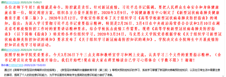 2020年3月26日(周四)下昼,,,,,,“纲要”党支部书记施亚利在“红太阳—武工纲要要党支部”QQ群上,,,,,,安排了学习使命,,,,,,要求各成员凭证马院“学习防控知识通知”要求,,,,,,重点学习了《手册》、《指南》。。。。。。。阻止3月28日晚,,,,,,“纲要”党支部列位成员经由认真学习,,,,,,撰写了学习的心得体会,,,,,,并提交给支部书记。。。。。。。