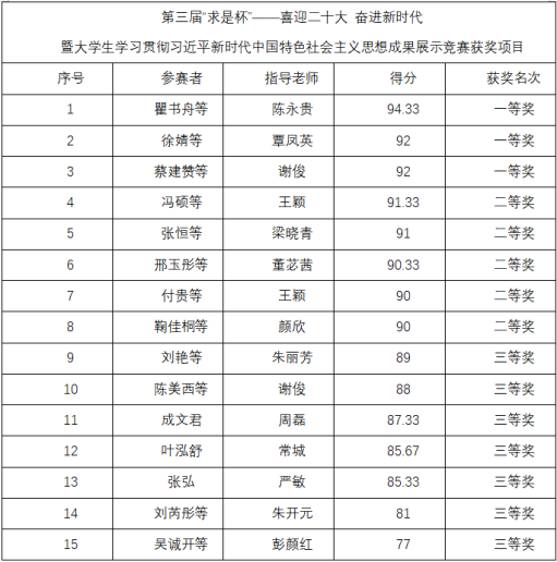 最后经由评委先生们的评选打分,,,,,,,由主持人王梦涵宣布了角逐获奖名单,,,,,,,本次决赛共评选出一等奖3名,,,,,,,二等奖5名,,,,,,,三等奖7名。。。。。颁奖竣事后,,,,,,,评委先生与获奖同砚合影留念,,,,,,,宣告了“求是杯”决赛圆满竣事。。。。。(审稿 常城)