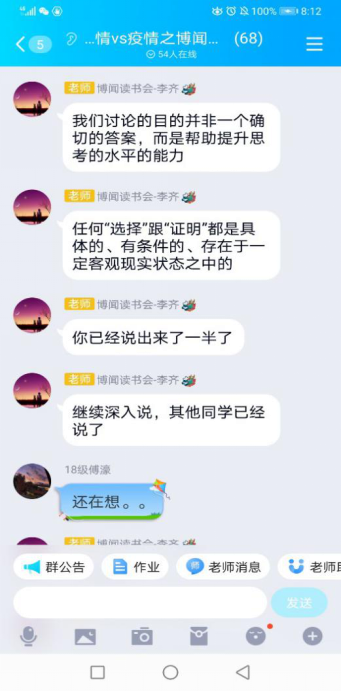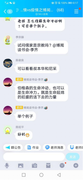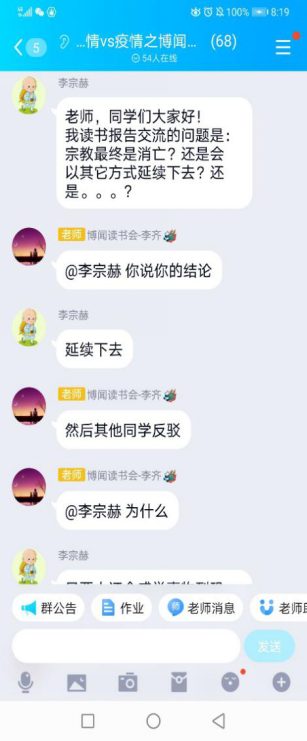(通讯员 刘许超新冠肺炎疫情时代, ,,,, ,在先生们的向导指导下, ,,,, ,马院学子以笔为友、以书为伴, ,,,, ,养成了“好念书, ,,,, ,读好书”的习惯。。。。。。。20204月8日, ,,,, ,武汉正式扫除封城之际, ,,,, ,马院学子开展了以“在生长中掌握人生意义”为主题的念书交流会。。。。。。。本次念书会通过QQ平台举行, ,,,, ,由李齐先生主持, ,,,, ,2018级与2019级部分硕士研究生加入了念书会。。。。。。。