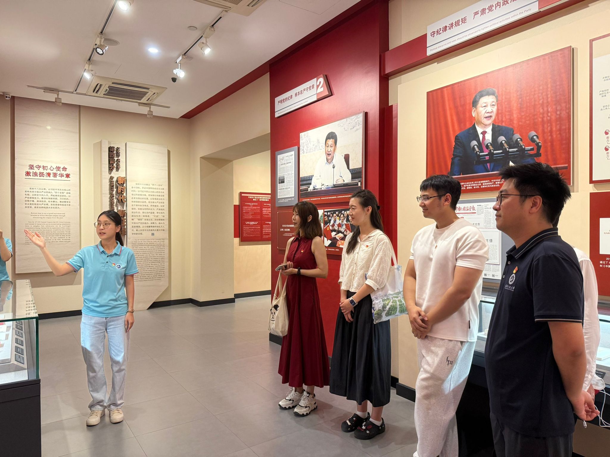 运动中,,,,,,,党员们还走进中国纪律建设摆设馆,,,,,,,通过“纪律建设永远在路上”专题展览,,,,,,,系统学习党的纪律建设历程。。。。。。从《中国共产党第一个纲要》中“守旧神秘”的最初要求,,,,,,,到“三大纪律八项注重”的严正军规;;;;;从“不拿群众一针一线”的古板,,,,,,,到新时代“八项划定”的作风新篇,,,,,,,一件件实物、一幅幅图片串联起党以自我革命引领社会革命的壮阔历程。。。。。。“纪律是党的生命线,,,,,,,更是我们立足立命的基础。。。。。。”